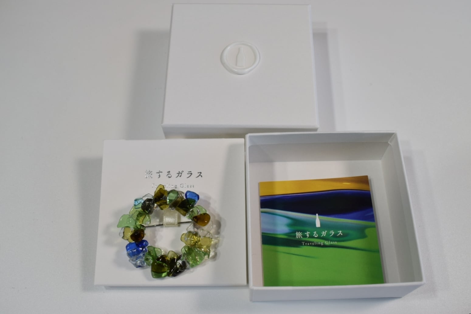 「旅するガラス」のロゴをエンボス加工でさりげなくあしらった