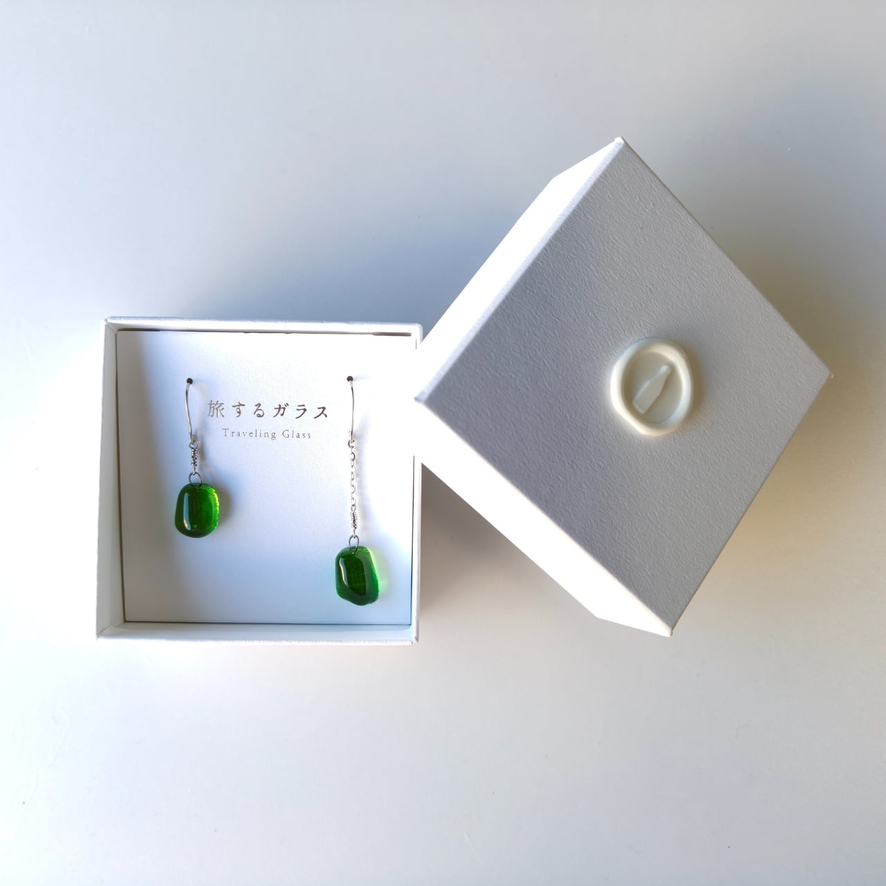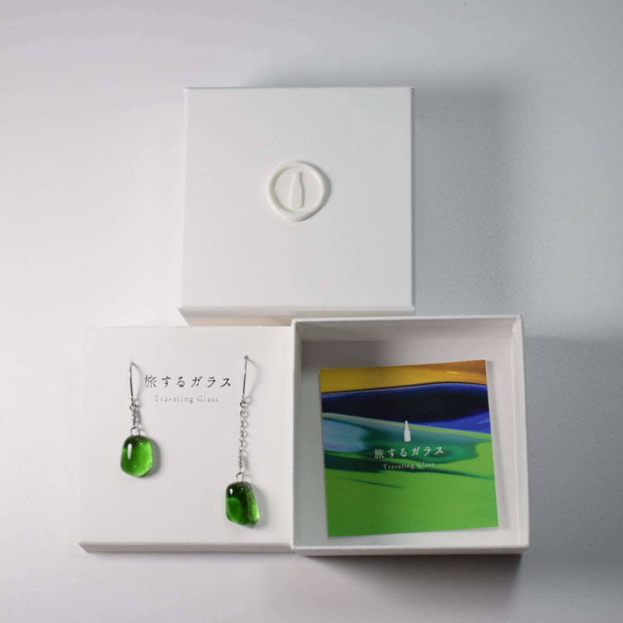 「旅するガラス」のロゴをエンボス加工でさりげなくあしらった上品な仕立てです。
