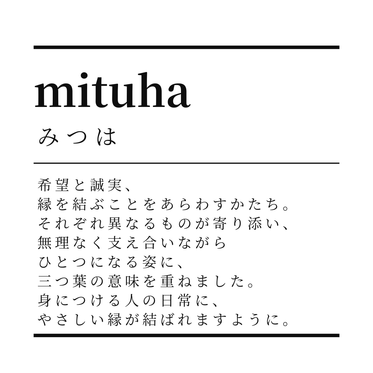 それぞれ異なるものが寄り添い、無理なく支え合いながらひとつになる姿に、三つ葉の意味を重ねました。